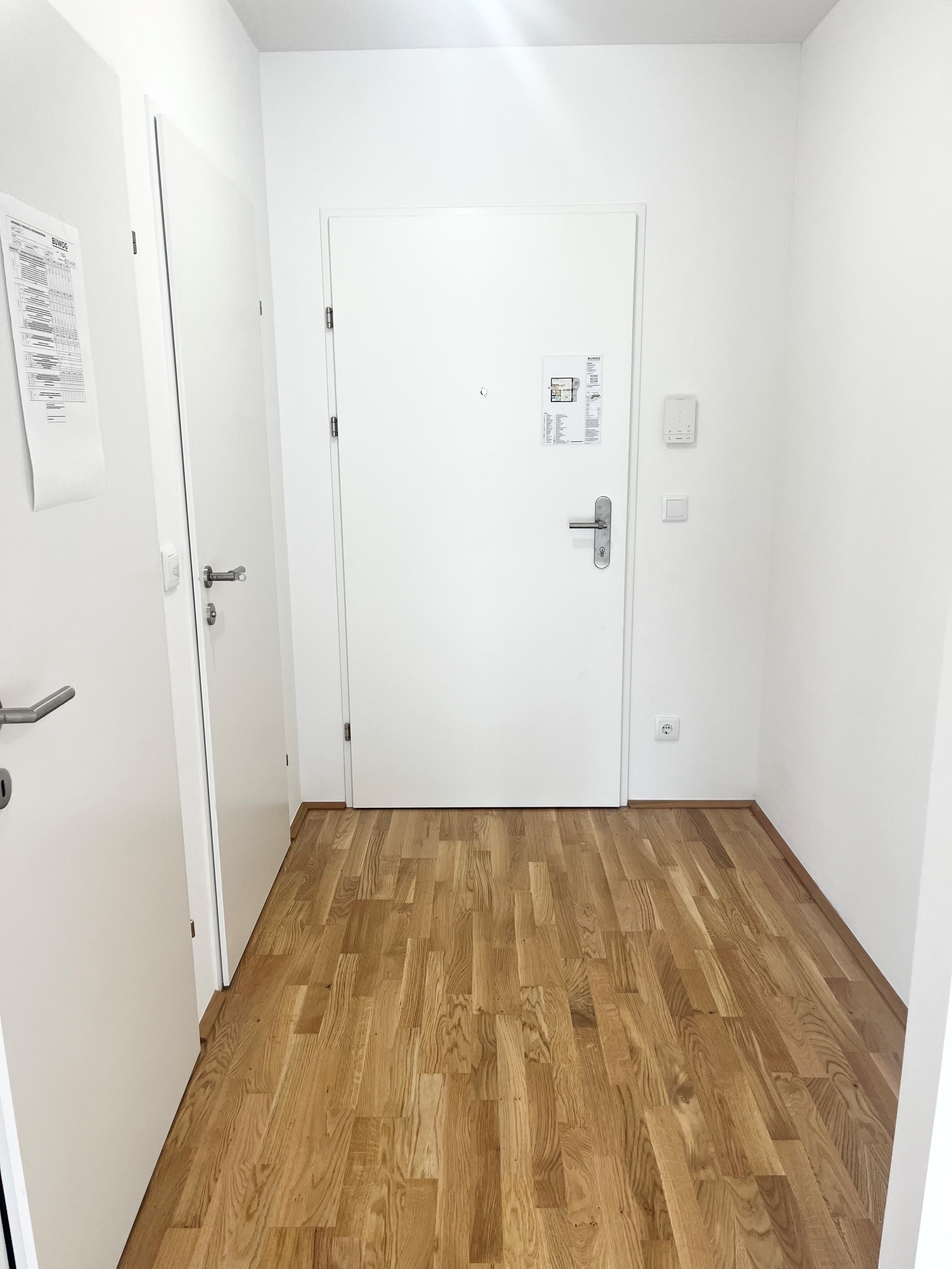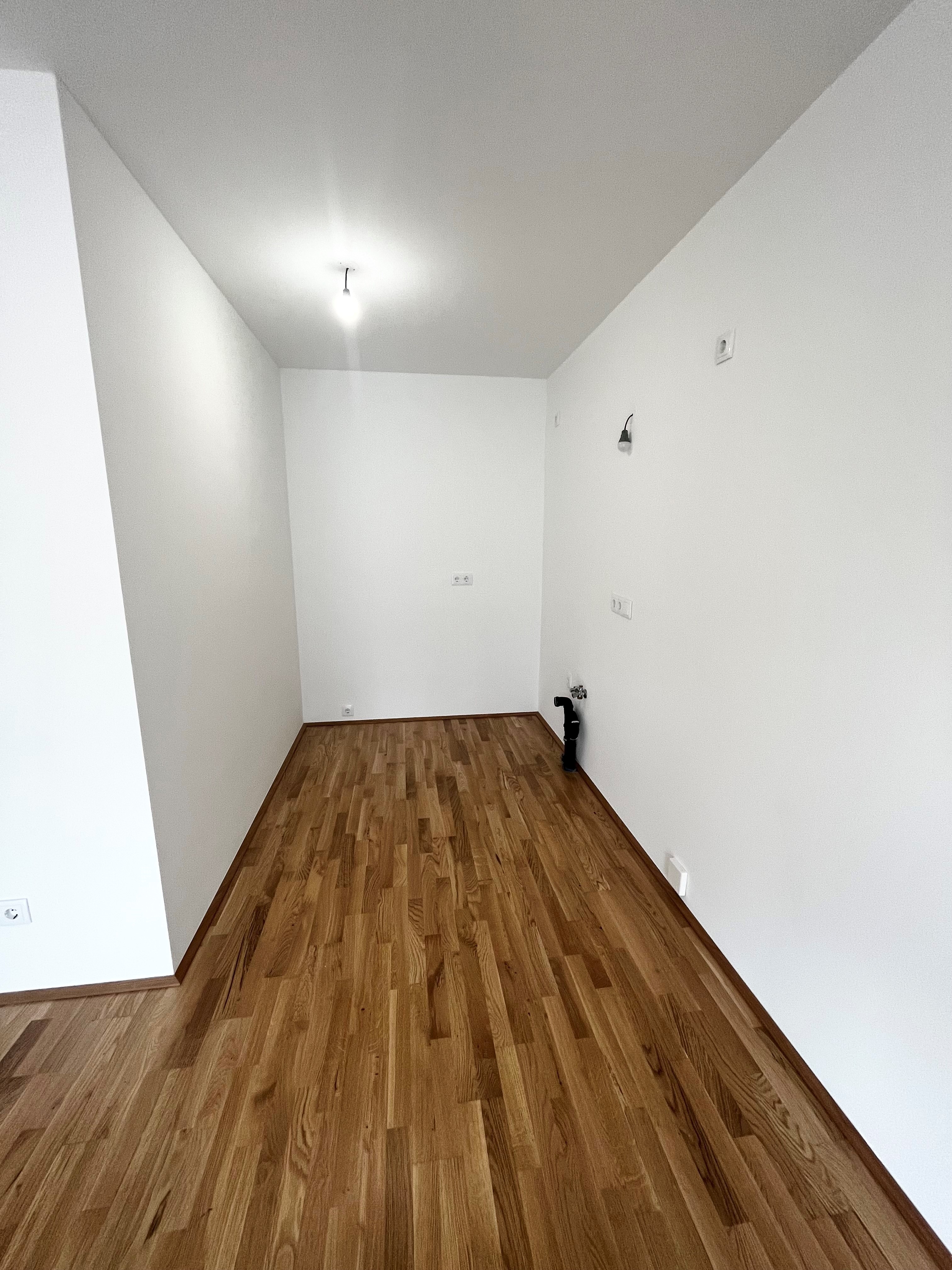 Die ostseitige Wohnung gliedert sich in einen Vorraum, einer separaten Toilette mit Handwaschbecken, einem Abstellraum und einen großzügigen Wohnraum mit einer voll ausgestatteten Küche mit Zugang zur Freifläche. Vom Schlafzimmer aus gelangt man in das Badezimmer, welches mit einer Dusche, einem Handwaschbecken, einem Waschmaschinenschluss und einem elektrischen Handtuchheizer ausgestattet ist.